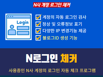 안녕하세요! 오늘 네이버 계정에 대한 자동로그인 체크 프로그램인 "N로그인 체커" 를 출시했습니다. [N로그인 체커 프로그램 특징] - 언디텍티드 크롬을 적용하여, 로그인시에 로그인캡차 우회적용 - 대량의 네이버 계정을 관리하는 분들에게, 계정에 대한 로그인 체크 기능 제공 - 블로그ID 생성 기능 : 블로그ID가 없는 계정에 대한 자동생성 옵션 제공 - 다양한 IP변경 기능 제공: 테더링/VPN/유동프록시 기능